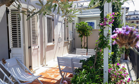 È un appartamento luminoso e soleggiato con una grande terrazza ricca di piante fiorite e una pergola ombrosa, al quinto e ultimo piano di un edificio in una strada tranquilla.
